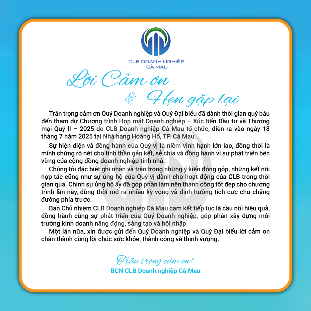 Ban Tổ chức Hội nghị CLB Doanh nghiệp Cà Mau xin trân trọng gửi lời cảm ơn sâu sắc đến Các Đơn vị tài trợ; Chủ tịch Hiệp Hội Doanh nghiệp tỉnh Cà Mau; Hội Doanh nhân trẻ tỉnh Cà Mau; Các Lãng hoa tươi thắm của Quý doanh nghiệp; Báo và Đài Phát thanh – Truyền hình Cà Mau đã dành thời gian quý báu tham dự chương trình